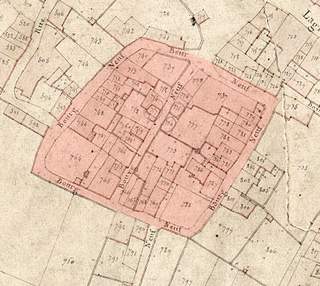Mais le bourg neuf recèle le secret de ses origines. En vue aérienne, ou encore plus flagrant, sur le vieux cadastre napoléonien, on est frappé par la forme singulière qu’adopte ce bourg neuf: un quadrilatère parfait, aux coins arrondies, de 73m de côté.