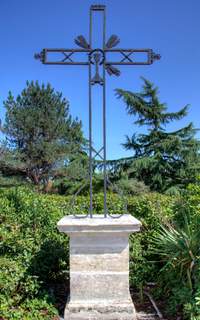 Cette croix représente une partie des instruments de la Passion: la croix, la couronne d'épine portée par Jésus pendant son supplice et le calice de l’agonie.
